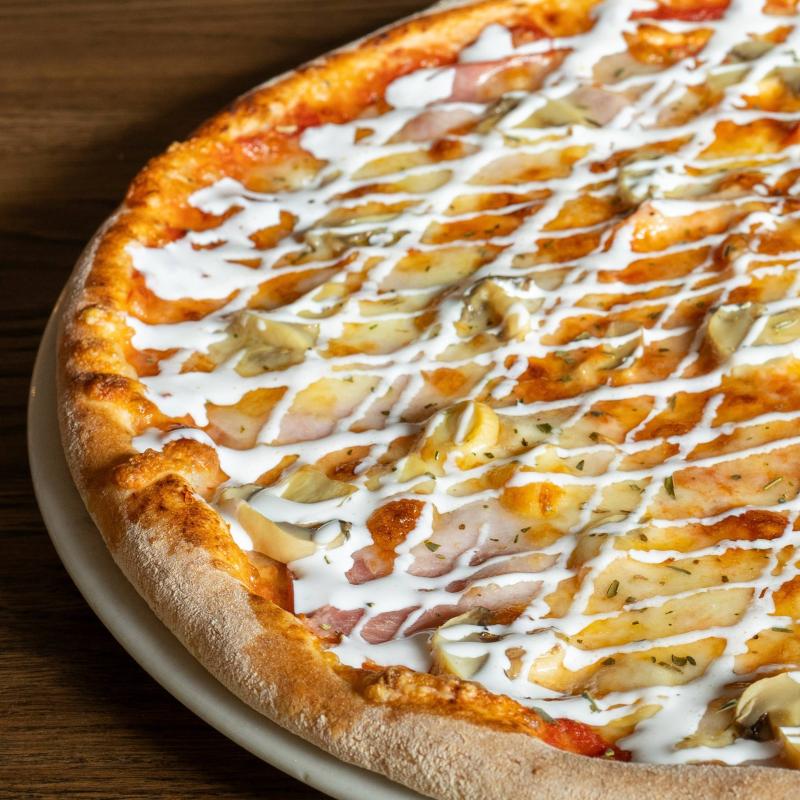 Сыр моццарелла, помидорная смесь, ветчина, шампиньоны консервированные, сливки