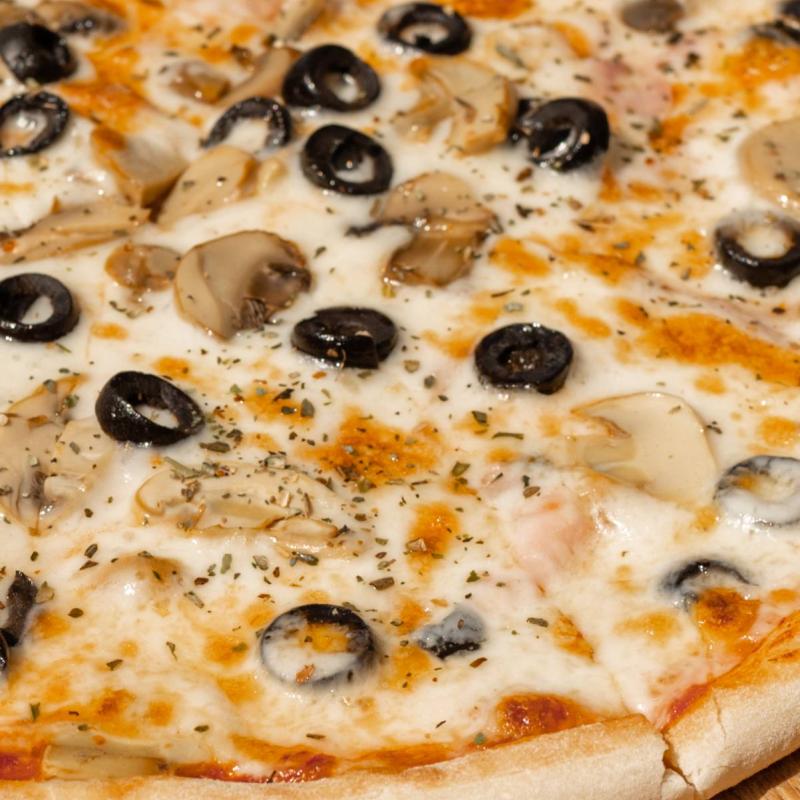 Сыр моццарелла, помидорная смесь, ветчина, шампиньоны консервированные, маслины, масло оливковое, орегано