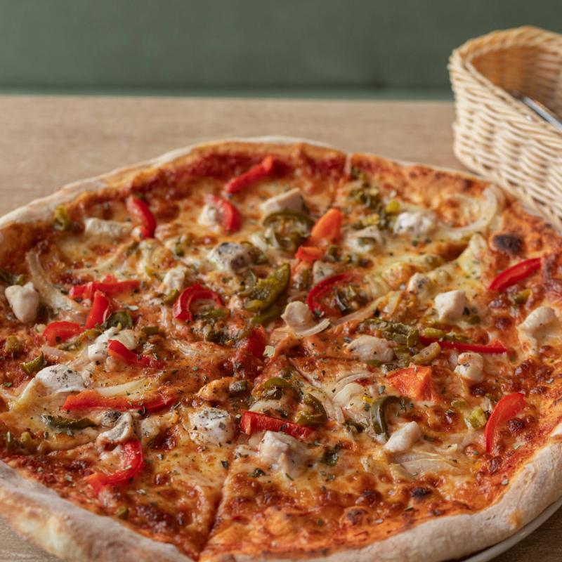 Сыр моццарелла, помидорная смесь, филе куриное, лук красный, перец халапеньо, перец свежий