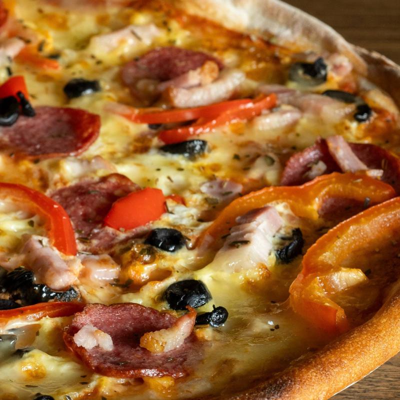 Сыр моцарелла, помидорная смесь, салями в/к, грудинка, ветчина, перец болгарский, томат св., орегано