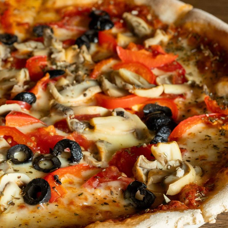 Сыр моццарелла, помидорная смесь, томат св., шампиньоны конс., перец св., маслины конс., орегано