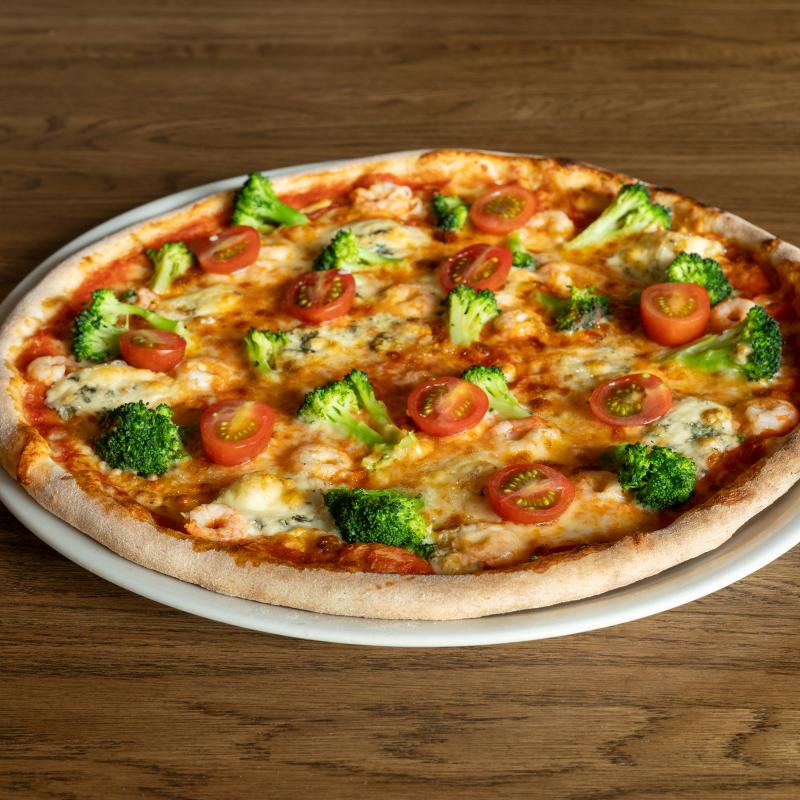 Сыр моццарелла, помидорная смесь, сыр горгонзола, капуста брокколи, креветки, томат черри, масло оливковое